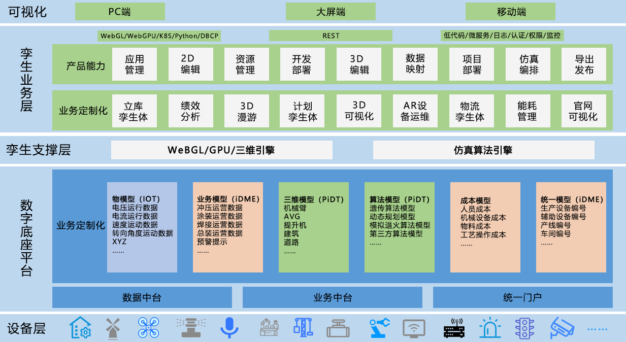 MasterBlue孪生平台采用模块化、松耦合的四层分层架构设计,分别为数据层、渲染层、功能层和应用层。该架构确保系统具备良好的可扩展性、可维护性与跨平台兼容性,能够灵活应对不同行业场景的定制化需求。