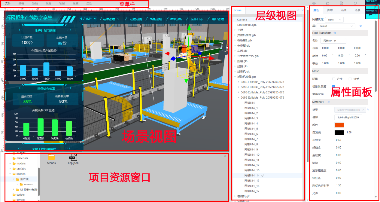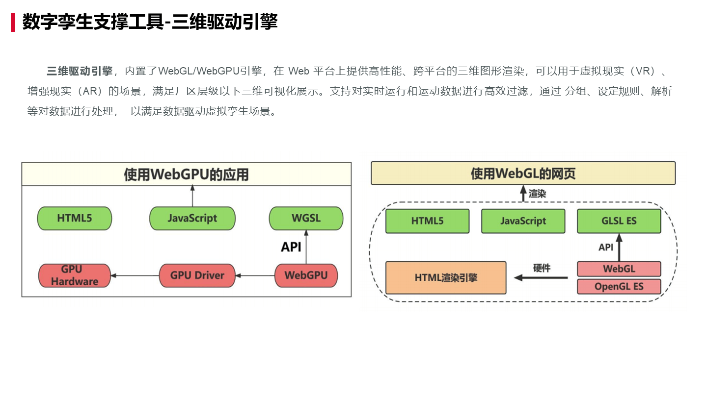 三维驱动引擎,内置了WebGL/WebGPU引擎,在Web平台上提供高性能、跨平台的三维图形渲染,可以用于虚拟现实(VR)、增强现实(AR)的场景,满足厂区层级以下三维可视化展示。支持对实时运行和运动数据进行高效过滤,通过分组、设定规则、解析等对数据进行处理,以满足数据驱动虚拟李生场景。