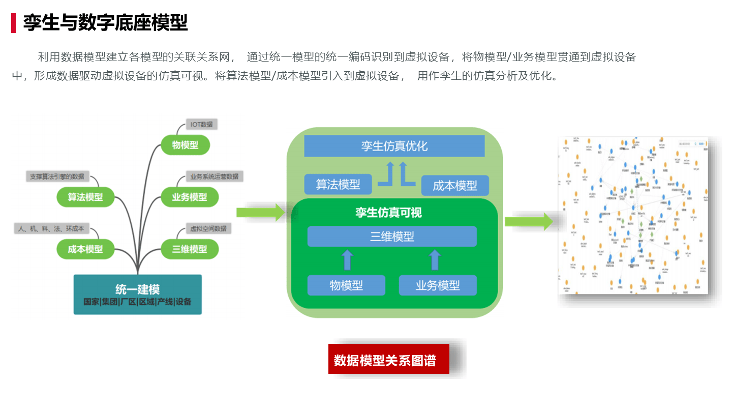 利用数据模型建立各模型的关联关系网,通过统一模型的统一编码识别到虚拟设备,将物模型/业务模型贯通到虚拟设备中,形成数据驱动虚拟设备的仿真可视。将算法模型/成本模型引入到虚拟设备,用作孪生的仿真分析及优化。