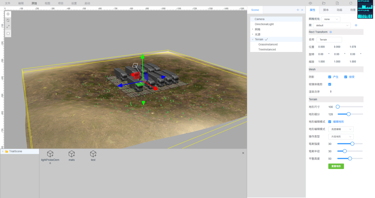 地形编辑:支持基于高程图(如GeoTIFF)生成地形,并提供“提升/挖掘”画笔,模拟填挖方工程。地形可融合倾斜摄影模型,实现真实地貌叠加。地形编辑支持刷植被、放置模型(如树木、建筑),并自动调整位置至地表。