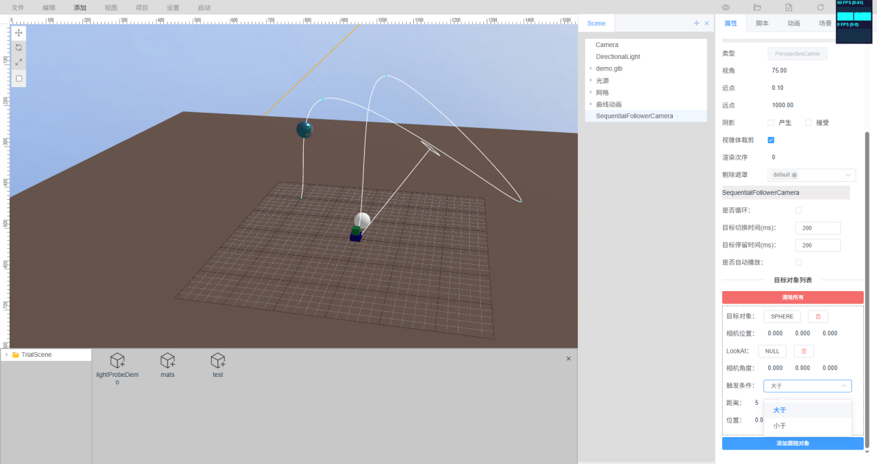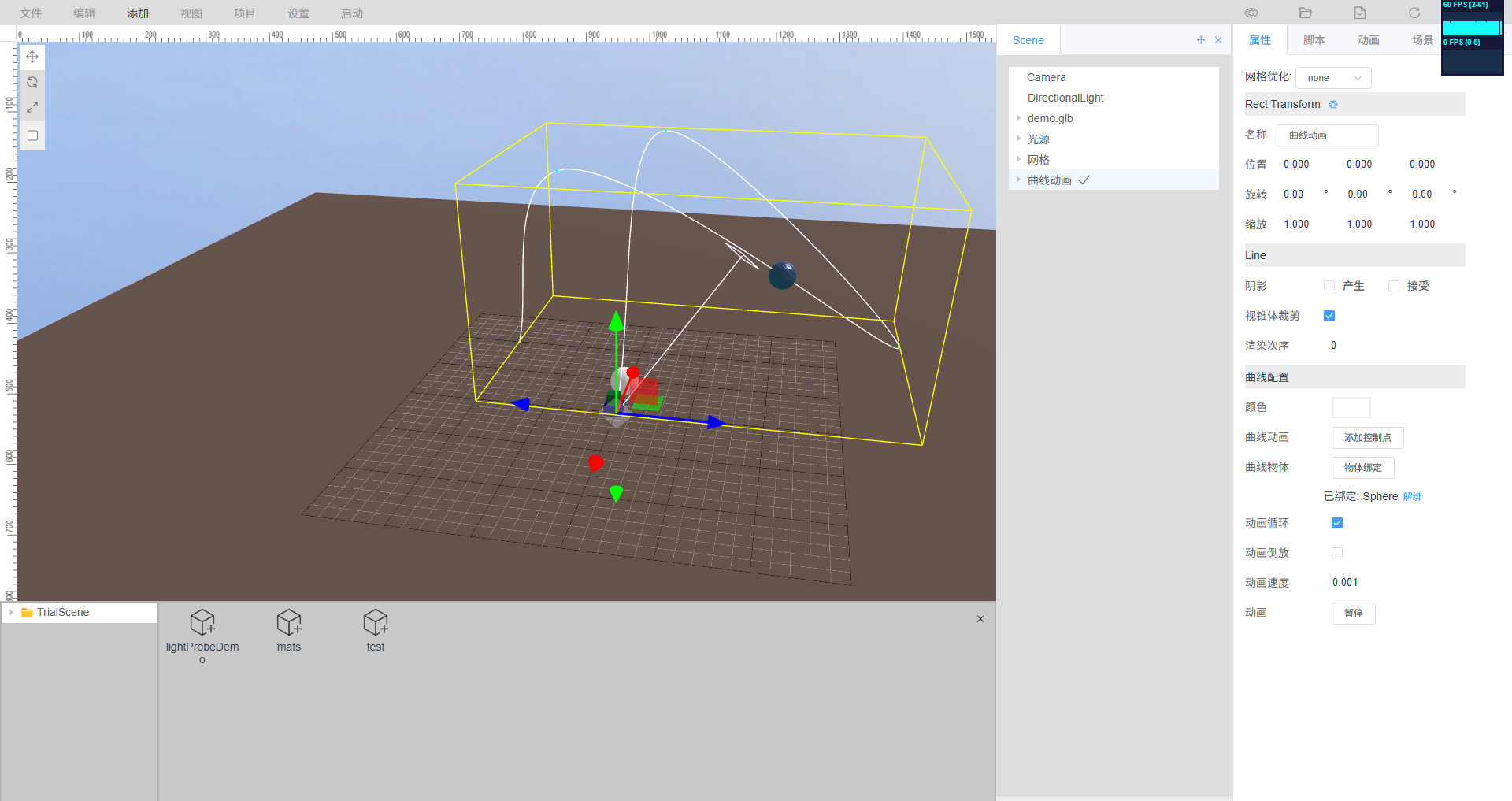 曲线动画:用户可以通过增加删除控制点调整曲线,然后绑定动画物体,让物体沿着曲线动画,可以配置动画的速度,循环,倒放等功能。
