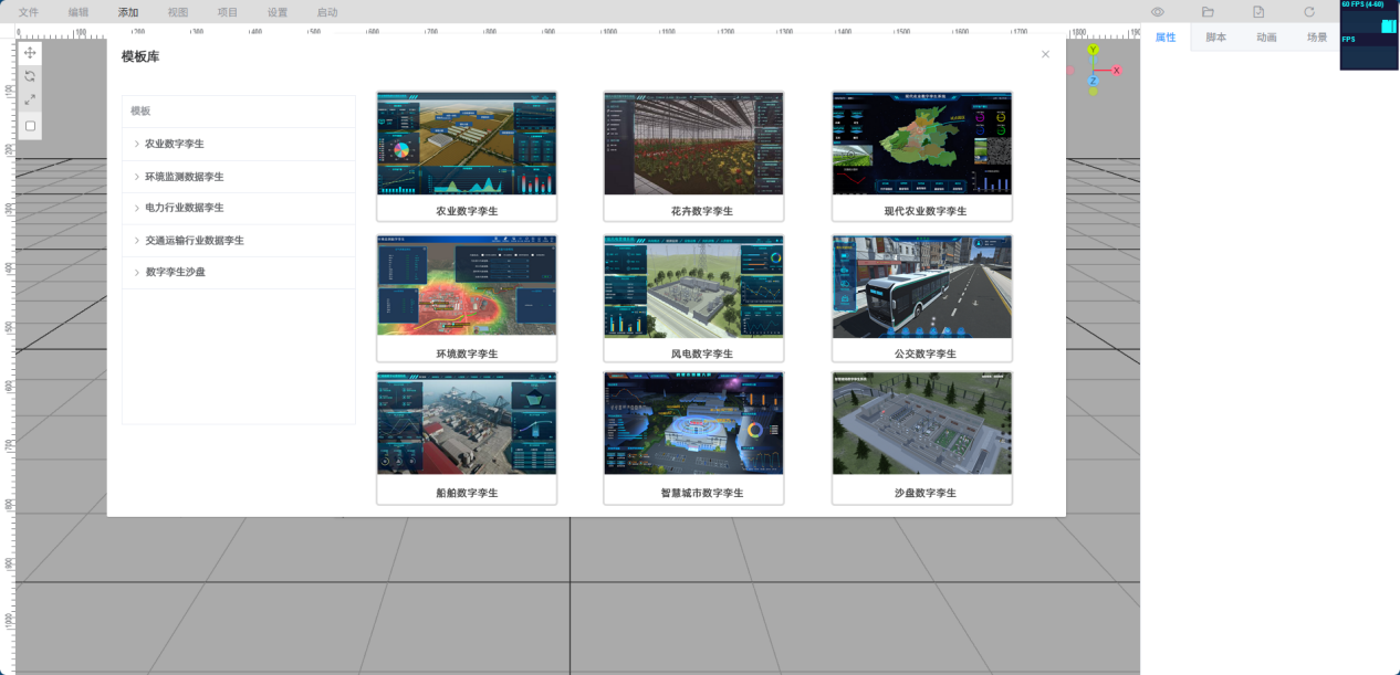 平台内置智能制造产线监控、电网运维大屏、智慧楼宇管理、军事态势推演、数字乡村、智慧港口、智慧水务等行业模板。每个模板包含预设的场景布局、数据模型、交互逻辑和UI组件,用户可一键调用并进行二次调整。模板库持续更新,用户也可上传自研模板分享至社区。