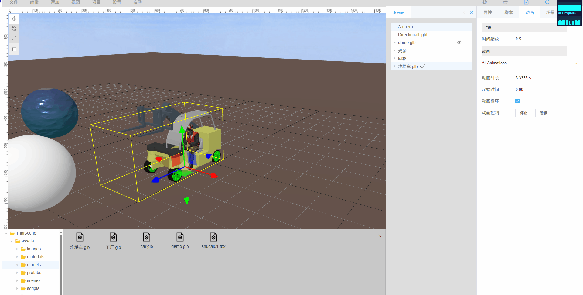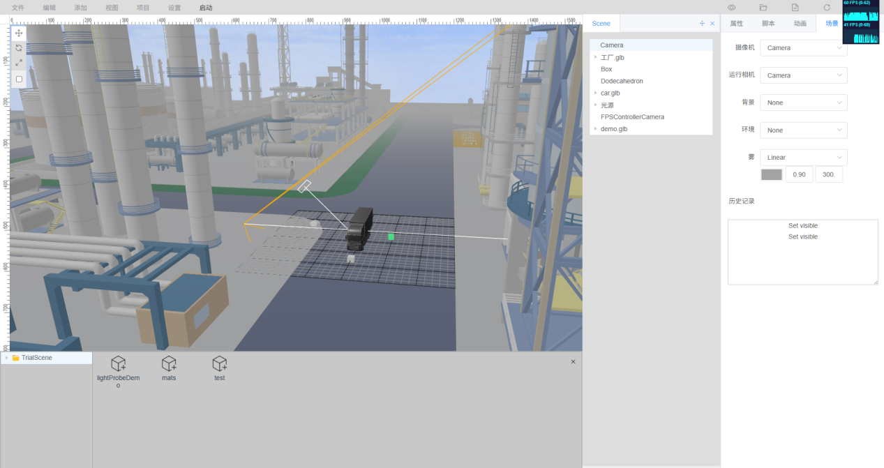 路径动画:用户可绘制三维路径,模型沿路径移动,并可设置朝向(始终面向路径方向或固定方向)。路径动画适用于AGV小车、无人机巡检等场景。