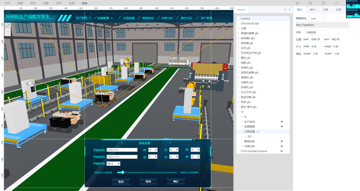 动画配置:为AGV小车设置路径动画,根据实时调度系统数据驱动小车移动。为机器人设置循环动画,模拟焊接、搬运动作。当设备故障时,触发闪烁动画并弹出报警窗口。
