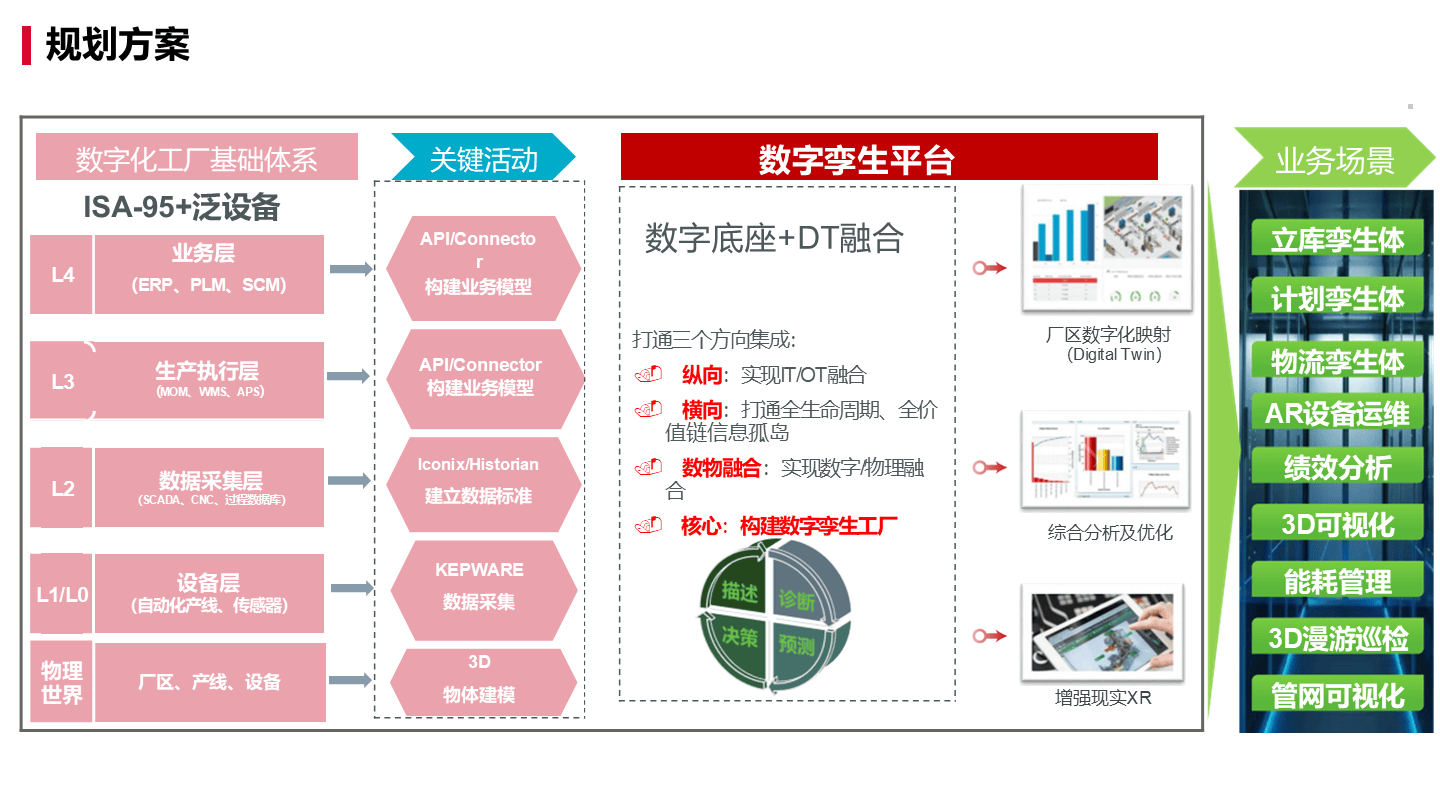 某汽车制造企业拥有冲压、焊装、涂装、总装四大车间,设备种类多、数据量大,传统监控系统为二维组态界面,难以直观反映生产线整体状态。企业希望建设数字孪生工厂,实现设备实时监控、故障预警、生产优化。