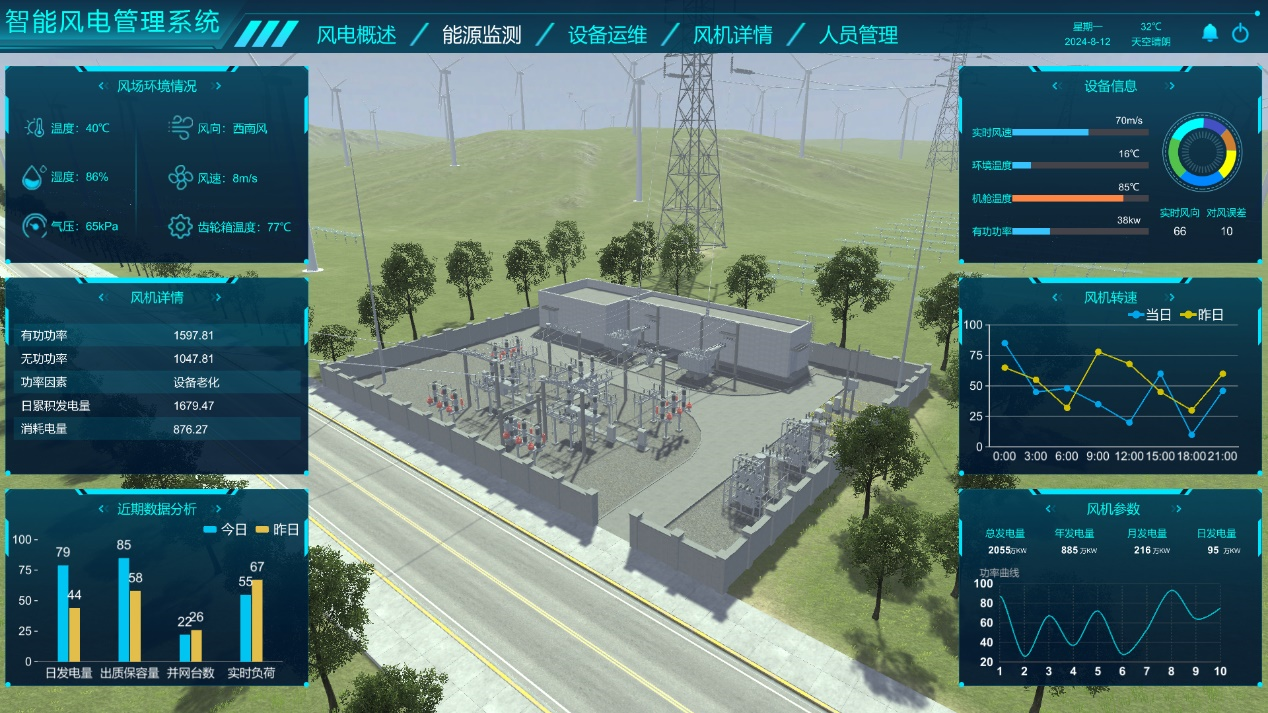 数据驱动动画:叶片转速根据实时风速动态调整;机舱偏航根据风向调整;功率曲线显示在风机旁边的小面板上。